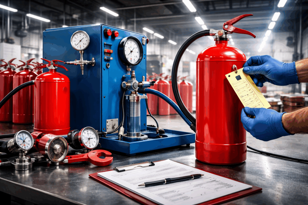 El retimbrado de extintores es una prueba obligatoria que garantiza que el cilindro puede soportar la presión de trabajo sin riesgo de fuga o explosión.